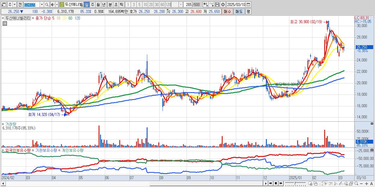 - 두산에너빌리티 (26,250원 ▼ -0.38% , 시총: 168,147억, 거래량: 6,310,178, 거래대금:1,647억)