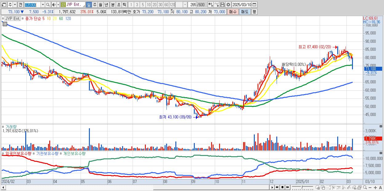 - JYP Ent. (73,100원 ▼ -9.31% , 시총: 25,974억, 거래량: 1,797,632, 거래대금:1,338억)