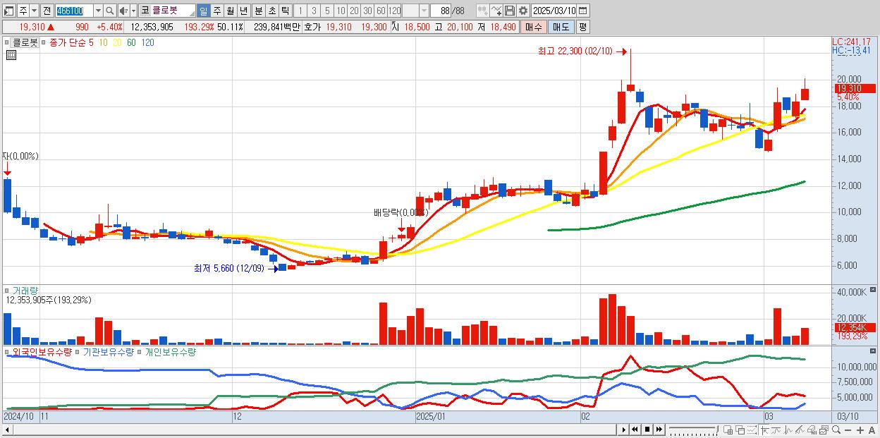 - 클로봇 (19,310원 ▲ 5.4% , 시총: 4,760억, 거래량: 12,353,905, 거래대금:2,398억)