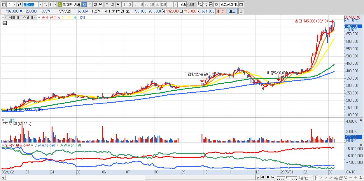 - 한화에어로스페이스 (702,000원 ▼ -3.97% , 시총: 319,980억, 거래량: 577,521, 거래대금:4,113억)