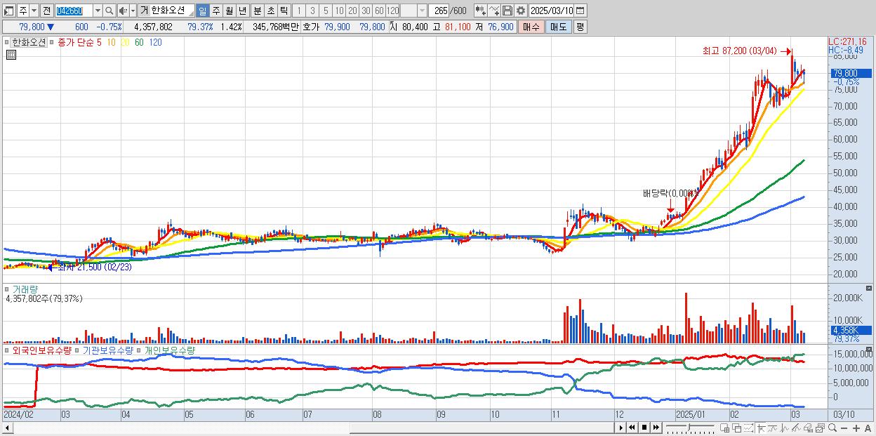 - 한화오션 (79,800원 ▼ -0.75% , 시총: 244,518억, 거래량: 4,357,802, 거래대금:3,458억)