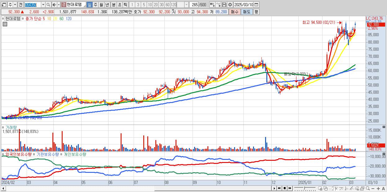 - 현대로템 (92,300원 ▲ 2.9% , 시총: 100,738억, 거래량: 1,501,877, 거래대금:1,382억)