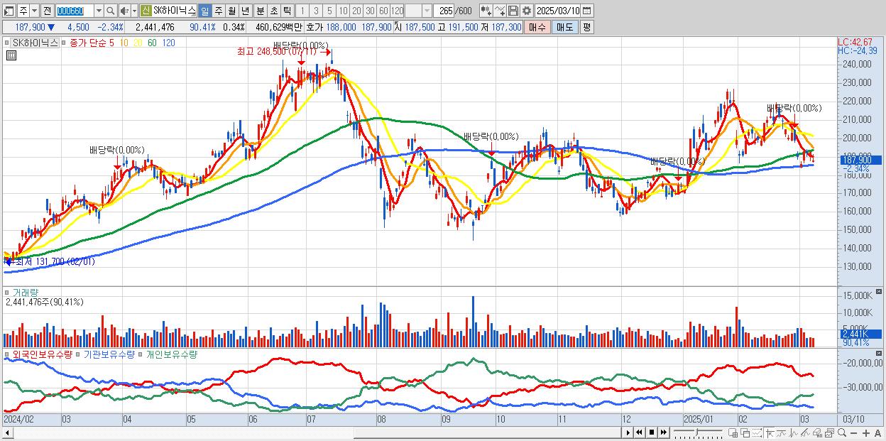 - SK하이닉스 (187,900원 ▼ -2.34% , 시총: 1,367,916억, 거래량: 2,441,476, 거래대금:4,606억)