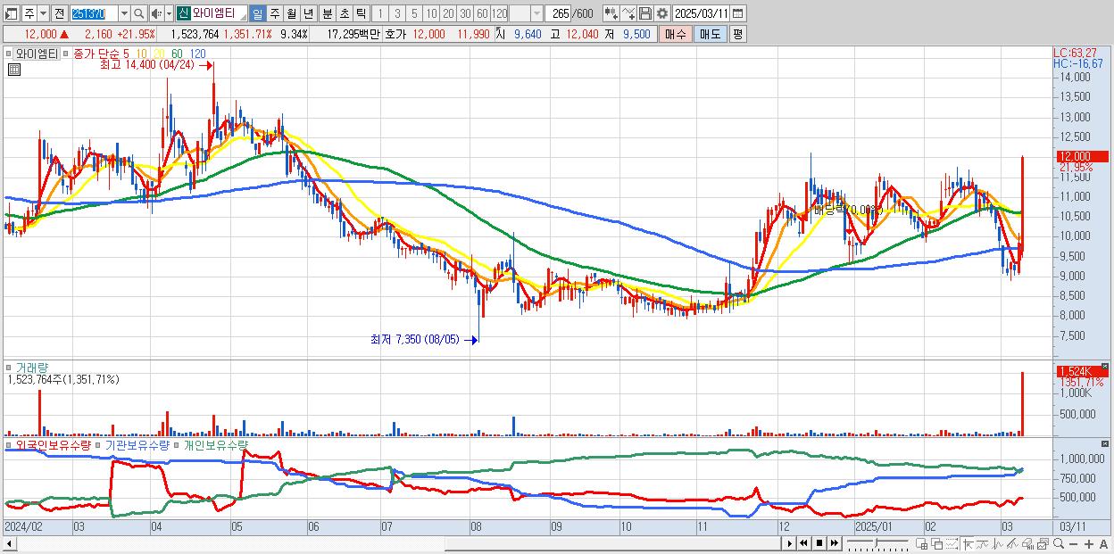 - 와이엠티 (12,000원 ▲ 21.95% , 시총: 1,958억, 거래량: 1,523,764, 거래대금:173억)