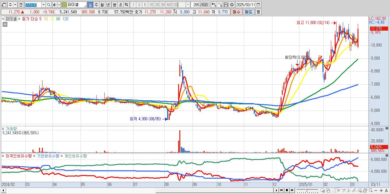 - 파미셀 (11,270원 ▲ 9.74% , 시총: 6,764억, 거래량: 5,241,549, 거래대금:578억)