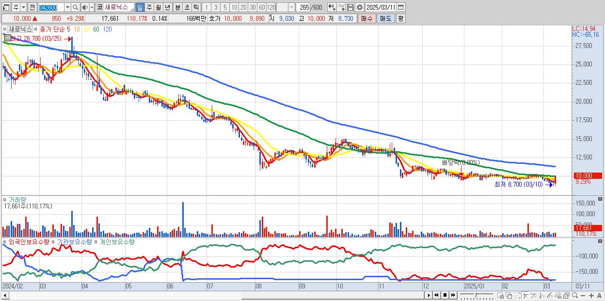 - 새로닉스 (10,000원 ▲ 9.29% , 시총: 1,242억, 거래량: 17,661, 거래대금:2억)