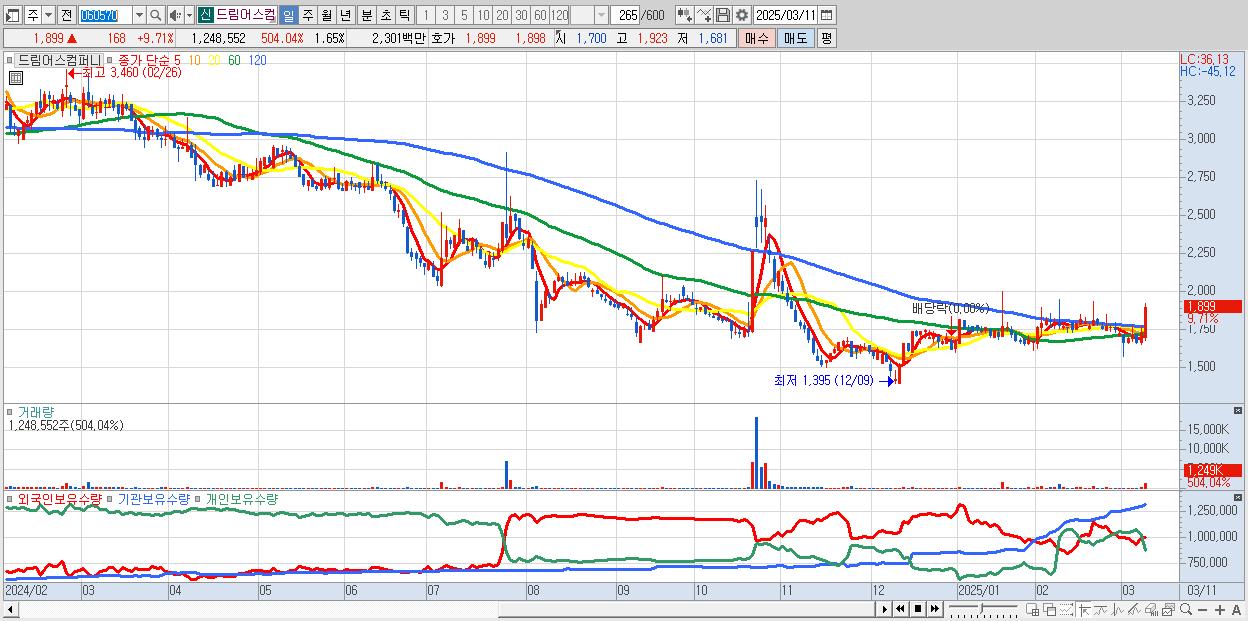 - 드림어스컴퍼니 (1,899원 ▲ 9.71% , 시총: 1,436억, 거래량: 1,248,552, 거래대금:23억)