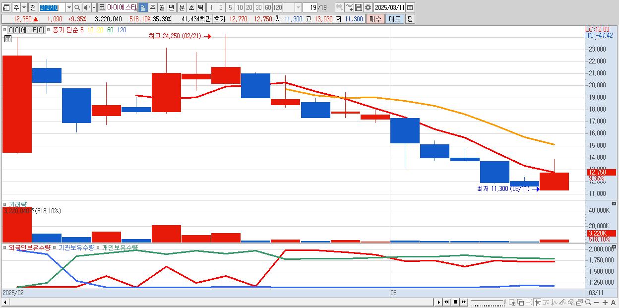 - 아이에스티이 (12,750원 ▲ 9.35% , 시총: 1,160억, 거래량: 3,220,040, 거래대금:414억)