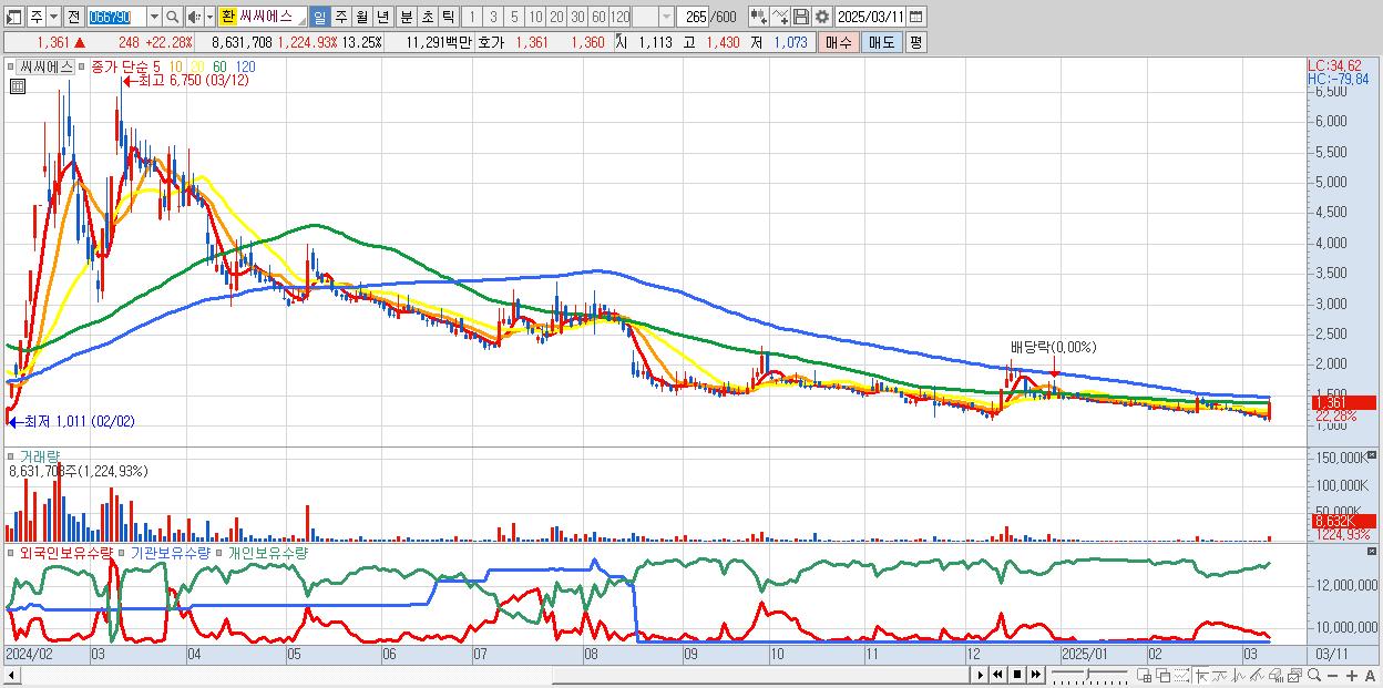 - 씨씨에스 (1,361원 ▲ 22.28% , 시총: 887억, 거래량: 8,631,708, 거래대금:113억)