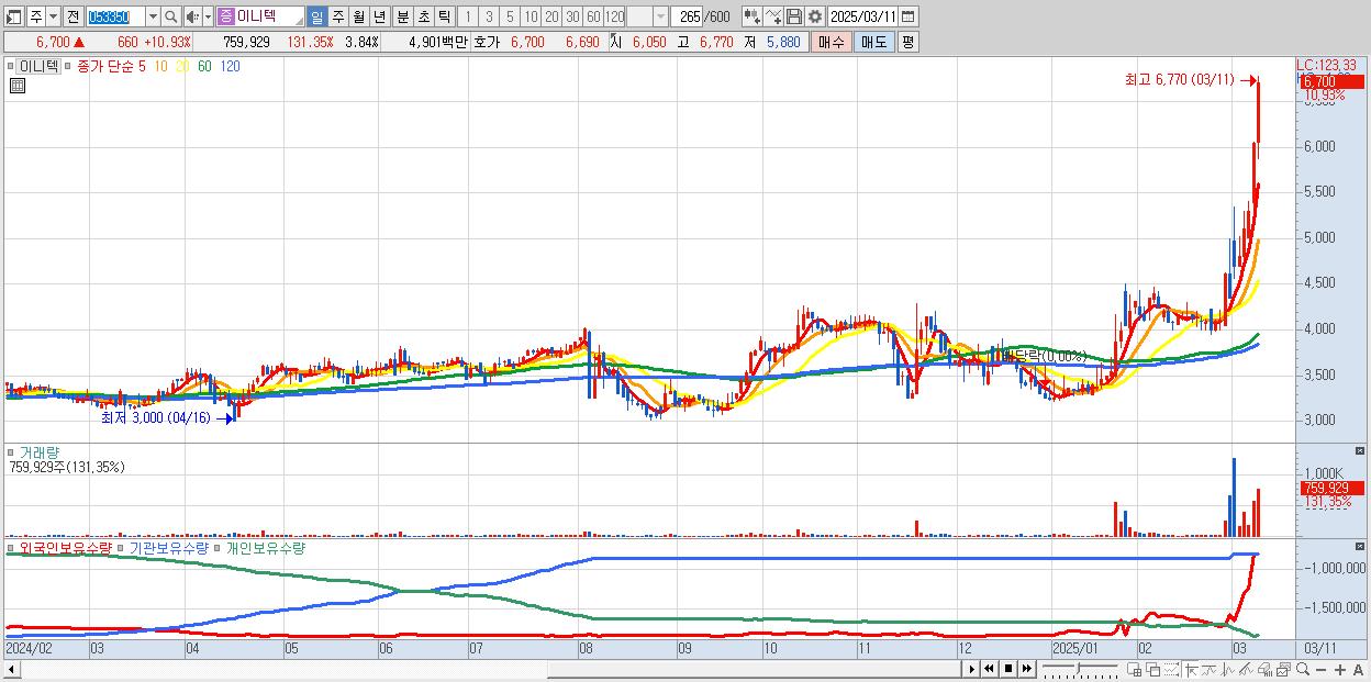- 이니텍 (6,700원 ▲ 10.93% , 시총: 1,326억, 거래량: 759,929, 거래대금:49억)
