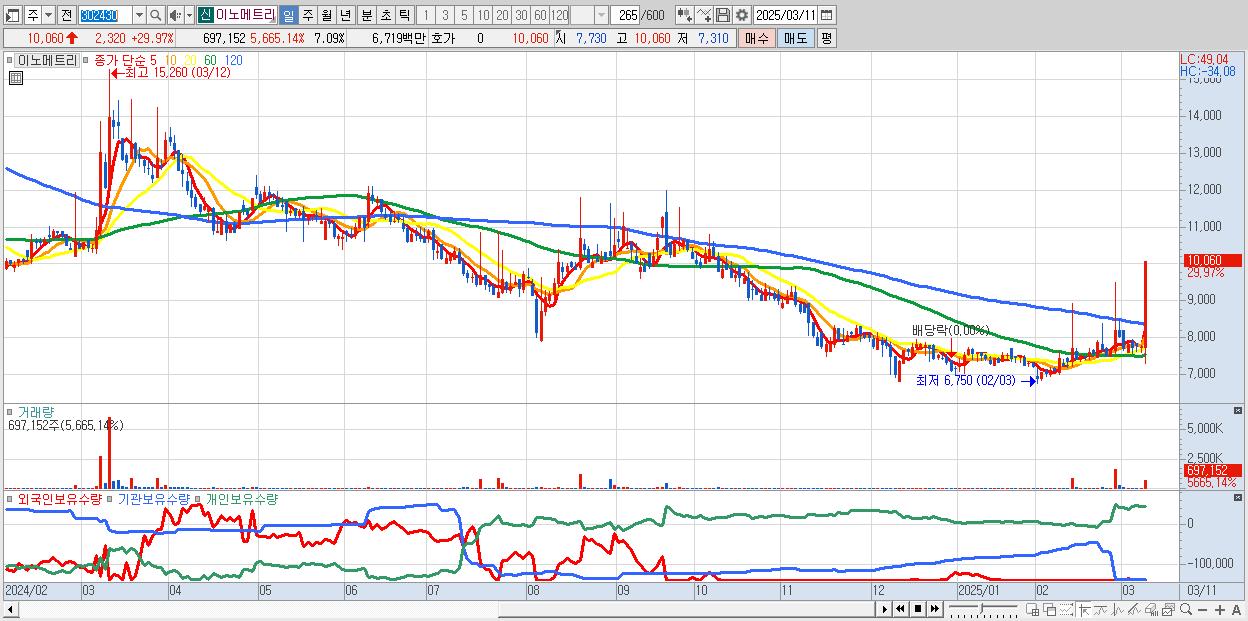 - 이노메트리 (10,060원 ▲ 29.97% , 시총: 989억, 거래량: 697,152, 거래대금:67억)