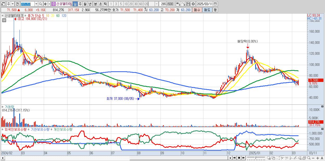 - 신성델타테크 (71,500원 ▲ 9.16% , 시총: 19,651억, 거래량: 814,276, 거래대금:563억)