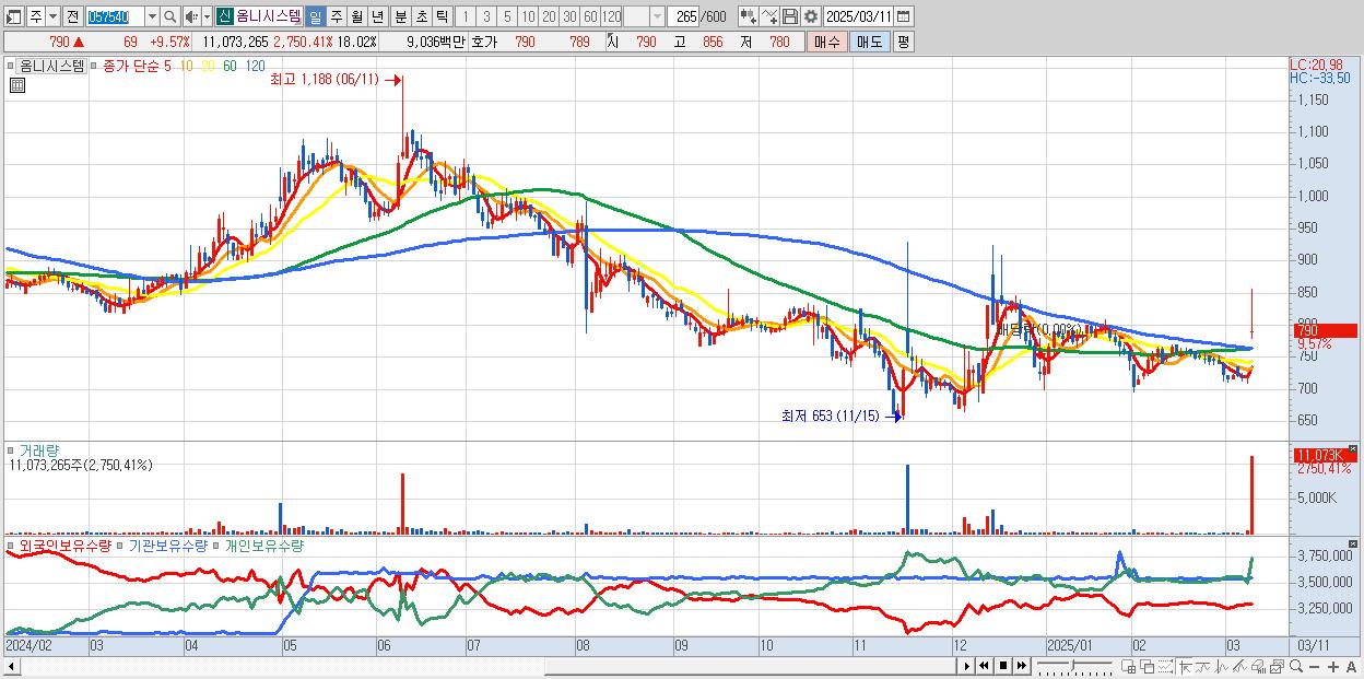 - 옴니시스템 (790원 ▲ 9.57% , 시총: 485억, 거래량: 11,073,265, 거래대금:90억)