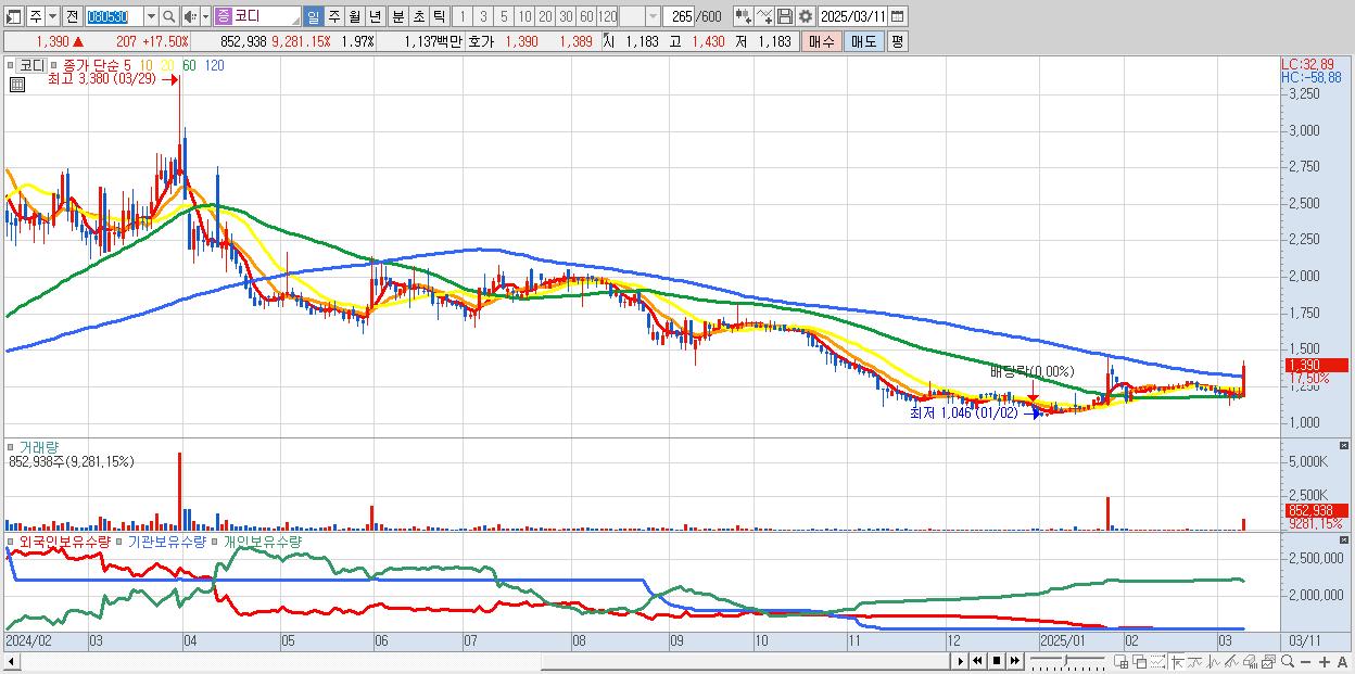 시총: 1,304억 거래량: 4,155,860 거래대금:729억 업종:전기·전자