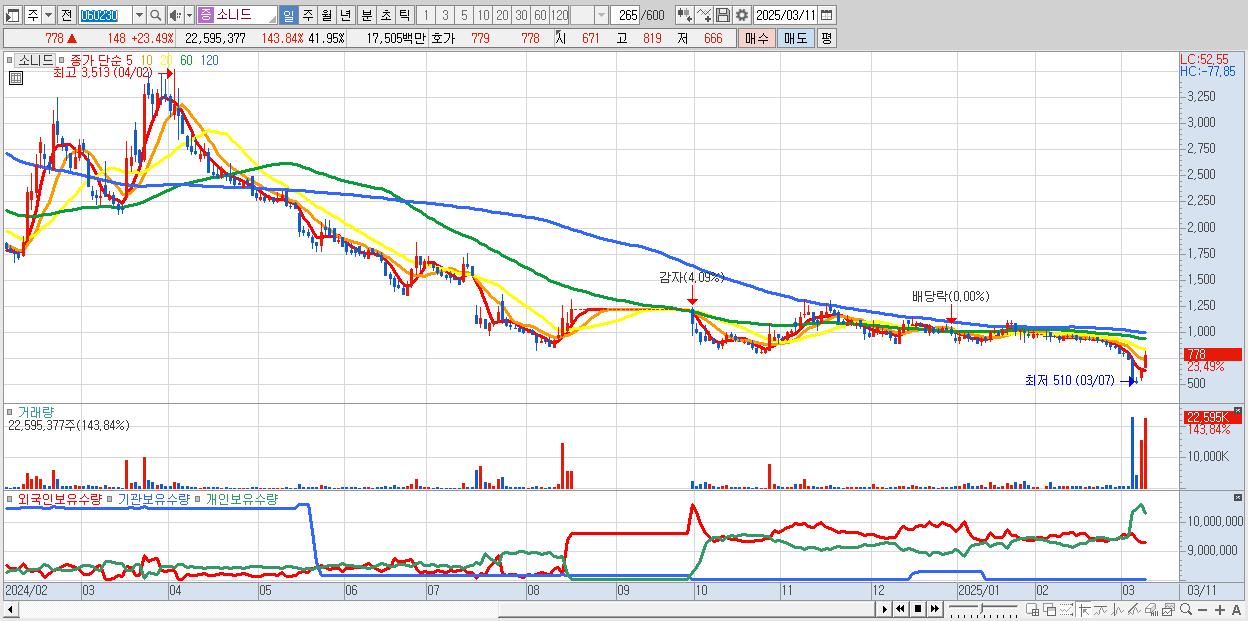 - 소니드 (778원 ▲ 23.49% , 시총: 419억, 거래량: 22,595,377, 거래대금:175억)