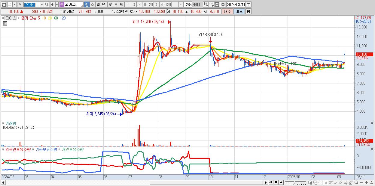 - 코아스 (10,100원 ▲ 10.87% , 시총: 332억, 거래량: 164,452, 거래대금:16억)