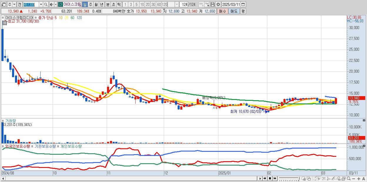 - 아이스크림미디어 (13,940원 ▲ 9.76% , 시총: 1,831억, 거래량: 63,201, 거래대금:8억)