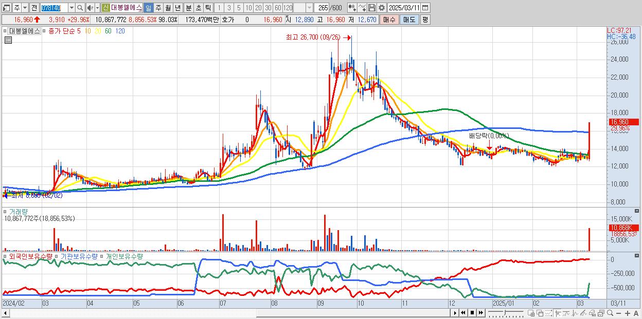 - 대봉엘에스 (16,960원 ▲ 29.96% , 시총: 1,880억, 거래량: 10,867,772, 거래대금:1,735억)