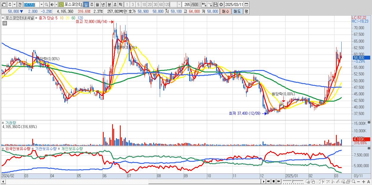 - 포스코인터내셔널 (58,800원 ▼ -3.29% , 시총: 103,443억, 거래량: 4,165,360, 거래대금:2,578억)