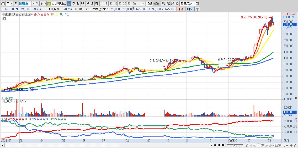 - 한화에어로스페이스 (678,000원 ▼ -3.42% , 시총: 309,040억, 거래량: 408,683, 거래대금:2,783억)