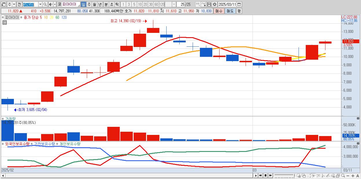 - 피아이이 (11,820원 ▲ 3.59% , 시총: 4,235억, 거래량: 14,797,281, 거래대금:1,694억)