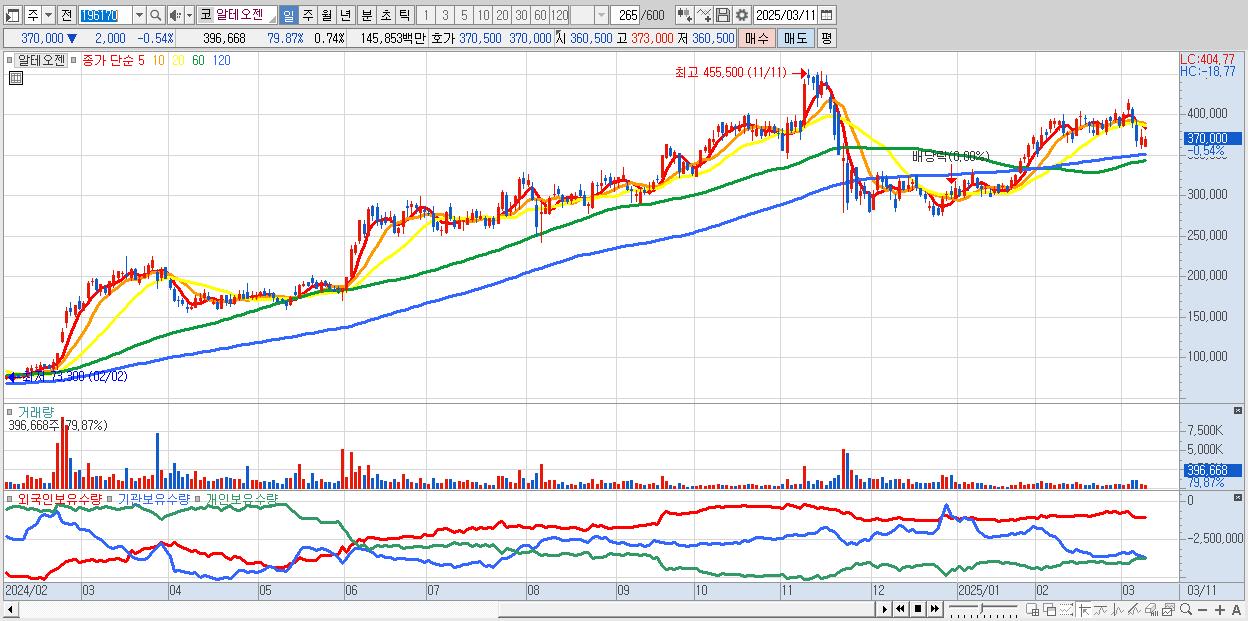 - 알테오젠 (370,000원 ▼ -0.54% , 시총: 197,280억, 거래량: 396,668, 거래대금:1,459억)