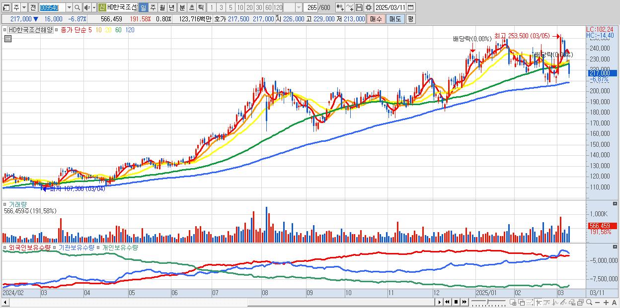 - HD한국조선해양 (217,000원 ▼ -6.87% , 시총: 153,578억, 거래량: 566,459, 거래대금:1,237억)