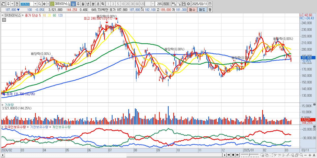 - SK하이닉스 (187,800원 ▼ -0.05% , 시총: 1,367,188억, 거래량: 3,521,800, 거래대금:6,497억)