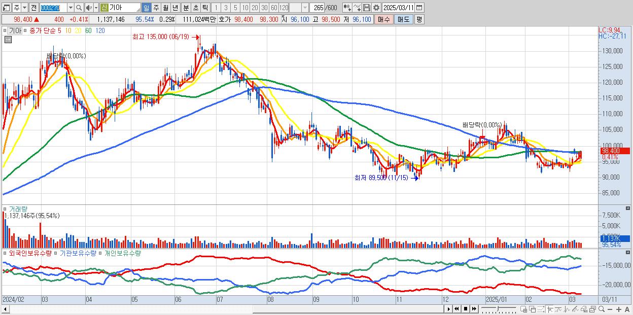 - 기아 (98,400원 ▲ 0.41% , 시총: 391,310억, 거래량: 1,137,146, 거래대금:1,110억)