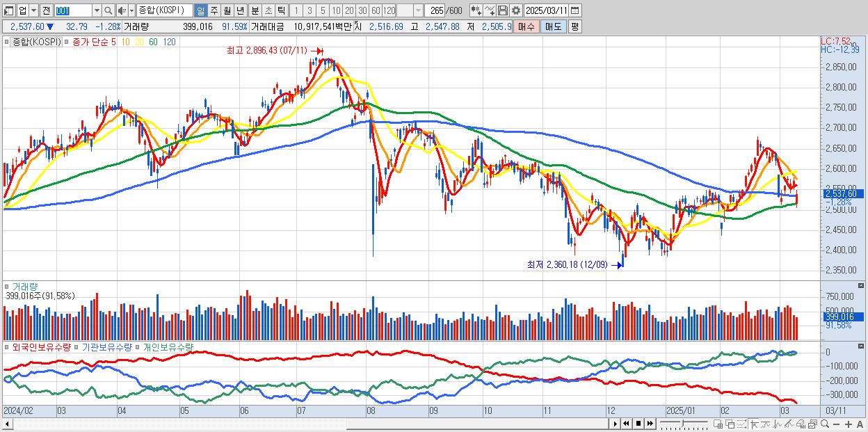 | 03/11 | 2,537.60 | ▼-1.28% | 4,929억 | -15,373억 | -2,381억 | 12,824억 |