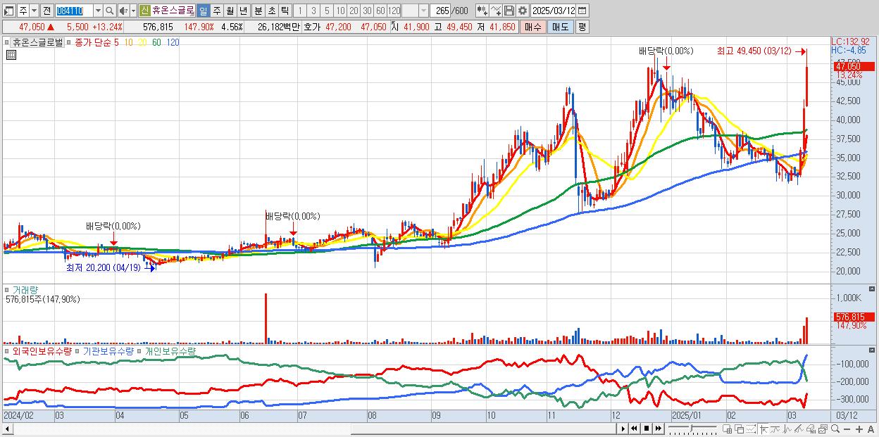 - 휴온스글로벌 (47,050원 ▲ 13.24% , 시총: 5,946억, 거래량: 576,815, 거래대금:262억)