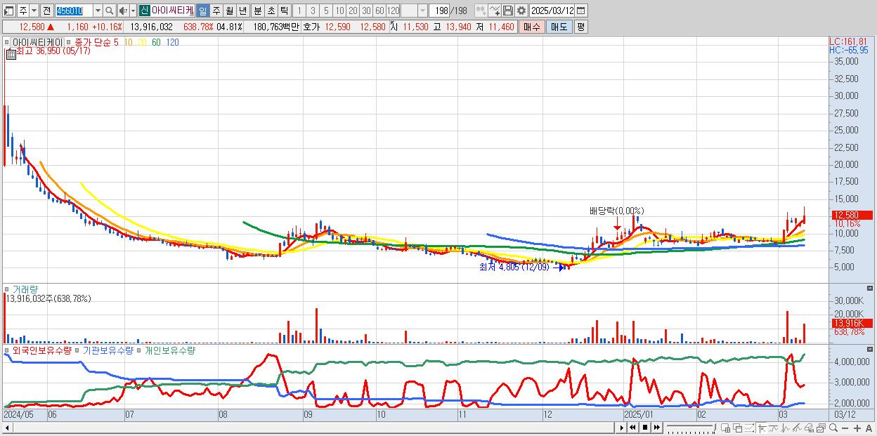 - 아이씨티케이 (12,580원 ▲ 10.16% , 시총: 1,670억, 거래량: 13,916,032, 거래대금:1,808억)