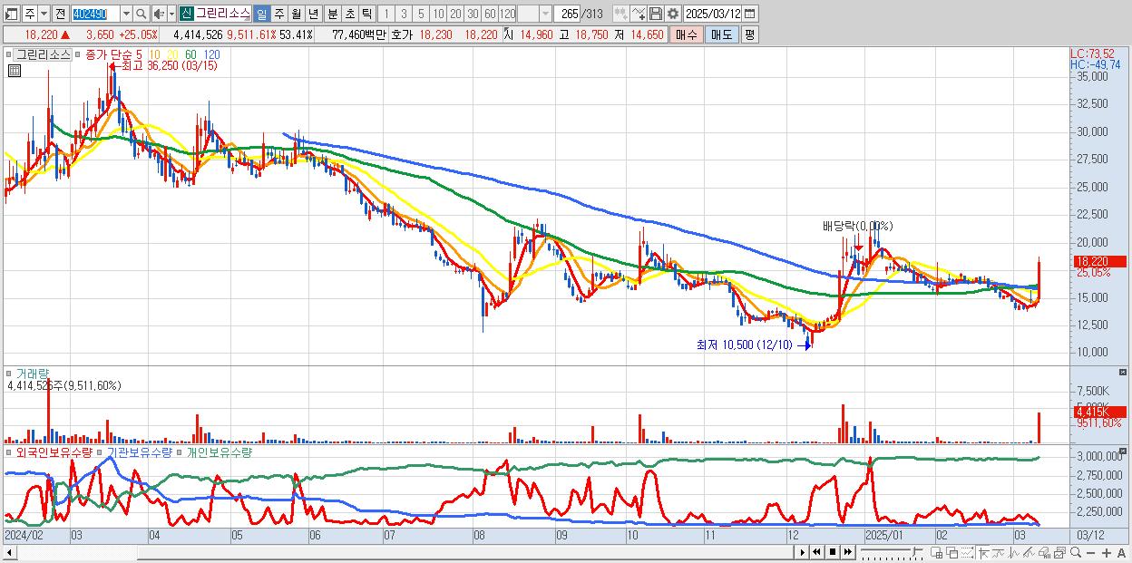 - 그린리소스 (18,220원 ▲ 25.05% , 시총: 1,506억, 거래량: 4,414,526, 거래대금:775억)