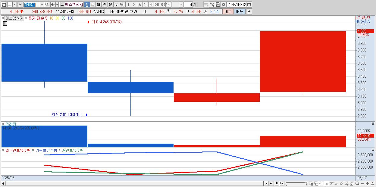 - 에스엠씨지 (4,085원 ▲ 29.89% , 시총: 752억, 거래량: 14,281,243, 거래대금:553억)
