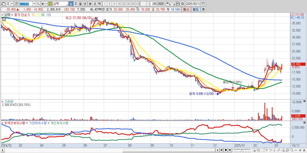 - 심텍 (20,450원 ▲ 9.95% , 시총: 6,514억, 거래량: 2,309,814, 거래대금:464억)