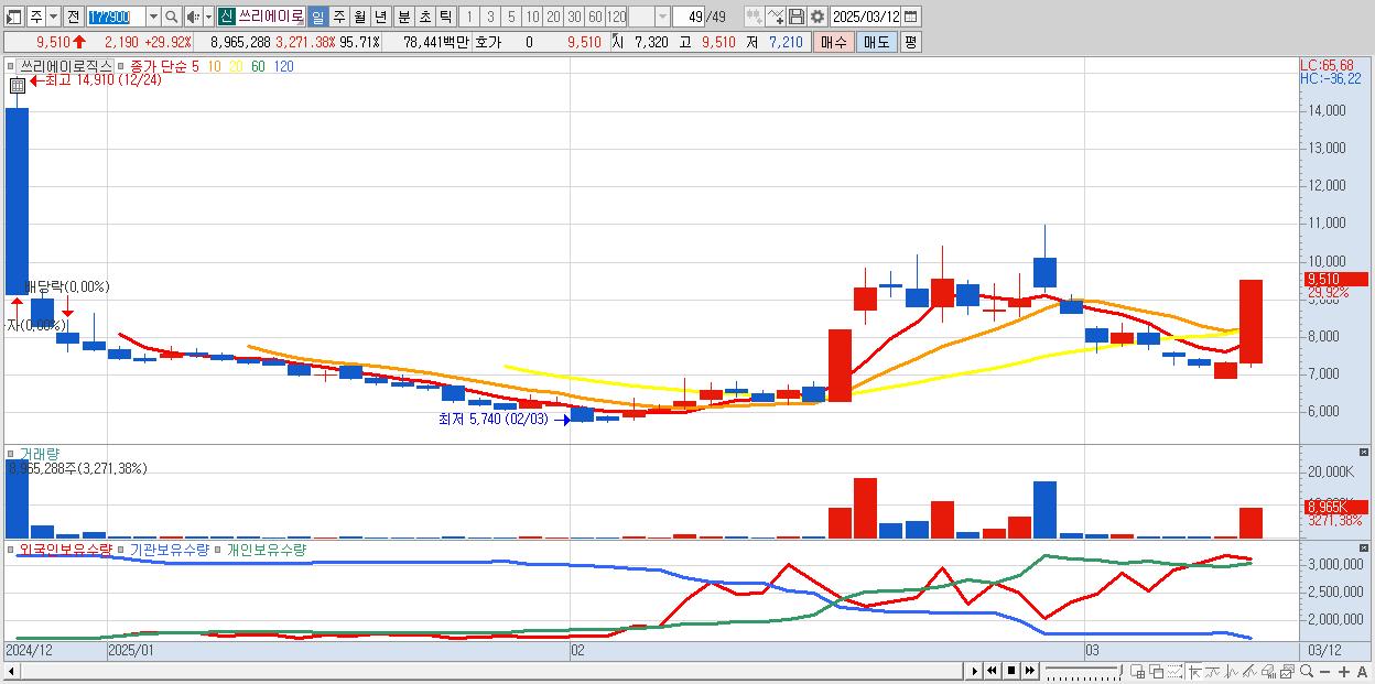 - 쓰리에이로직스 (9,510원 ▲ 29.92% , 시총: 891억, 거래량: 8,965,288, 거래대금:784억)