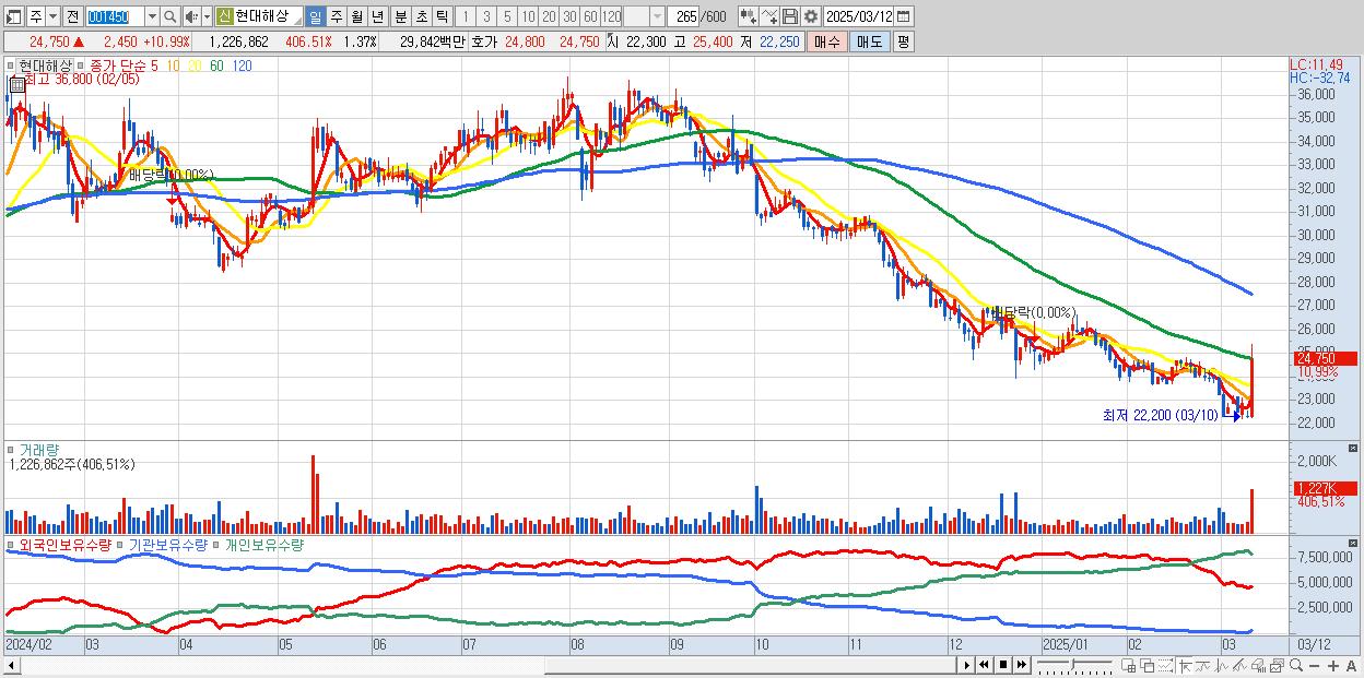- 현대해상 (24,750원 ▲ 10.99% , 시총: 22,127억, 거래량: 1,226,862, 거래대금:298억)