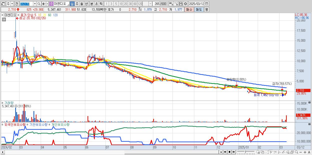 - 아센디오 (2,710원 ▲ 29.98% , 시총: 281억, 거래량: 5,347,461, 거래대금:136억)