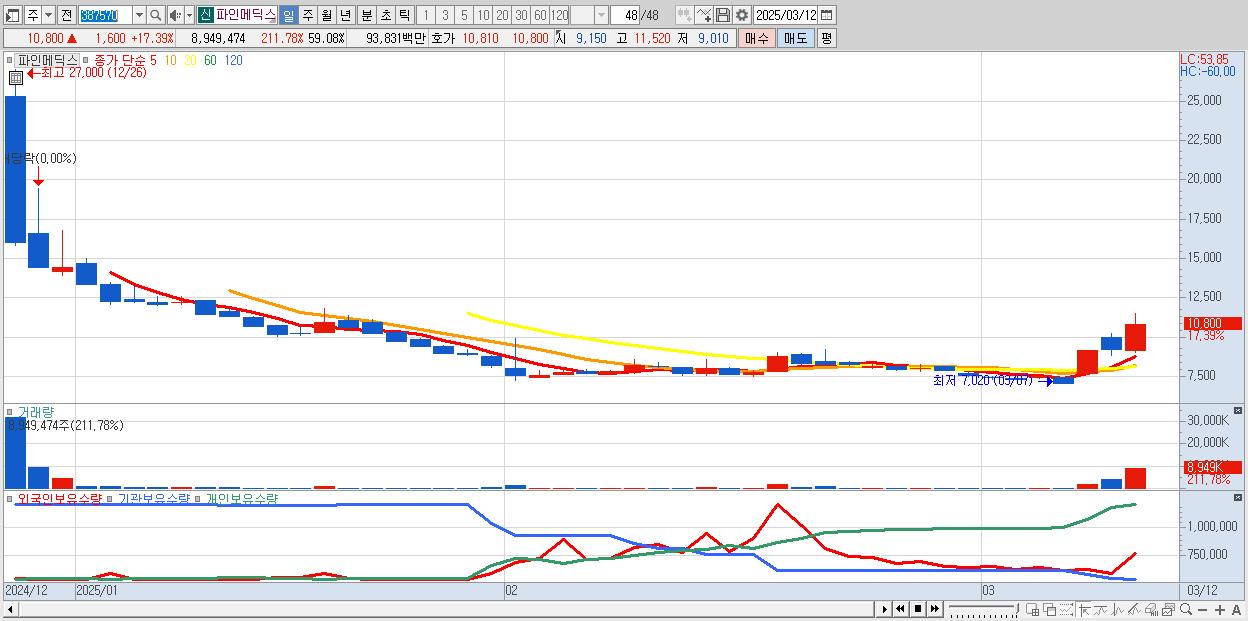 - 파인메딕스 (10,800원 ▲ 17.39% , 시총: 608억, 거래량: 8,949,474, 거래대금:938억)
