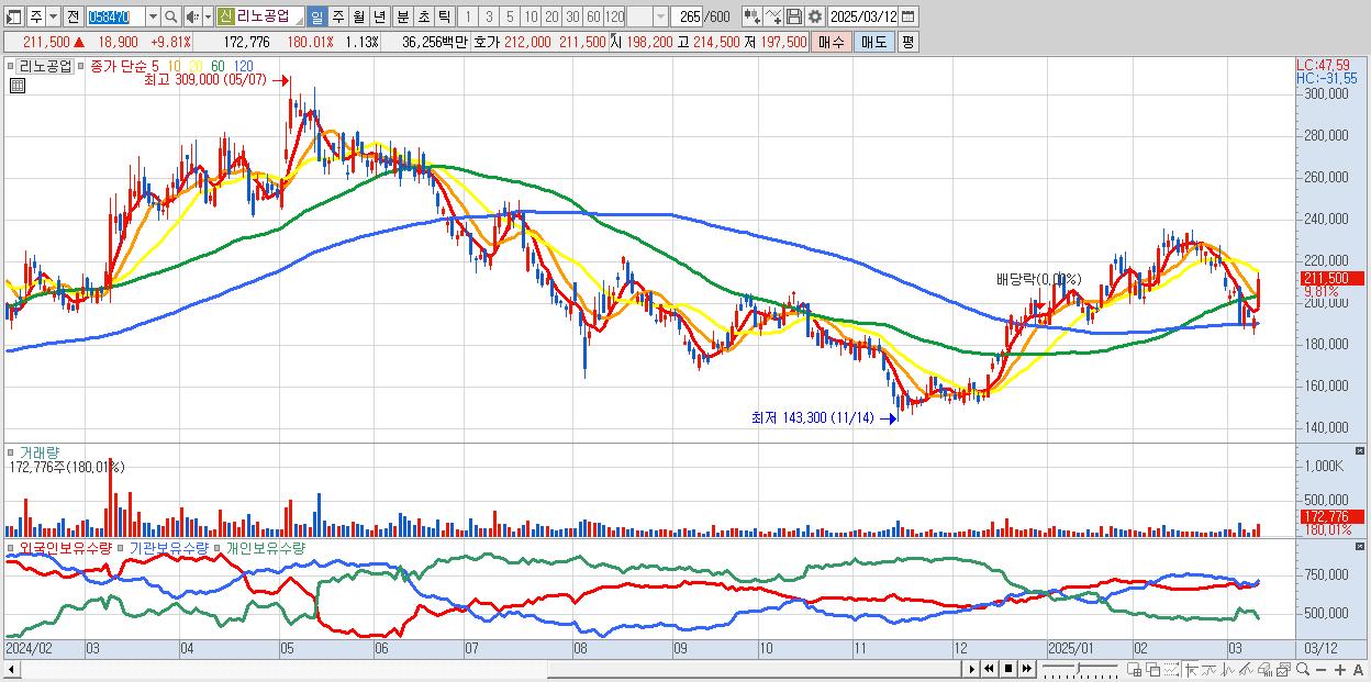 - 리노공업 (211,500원 ▲ 9.81% , 시총: 32,238억, 거래량: 172,776, 거래대금:363억)