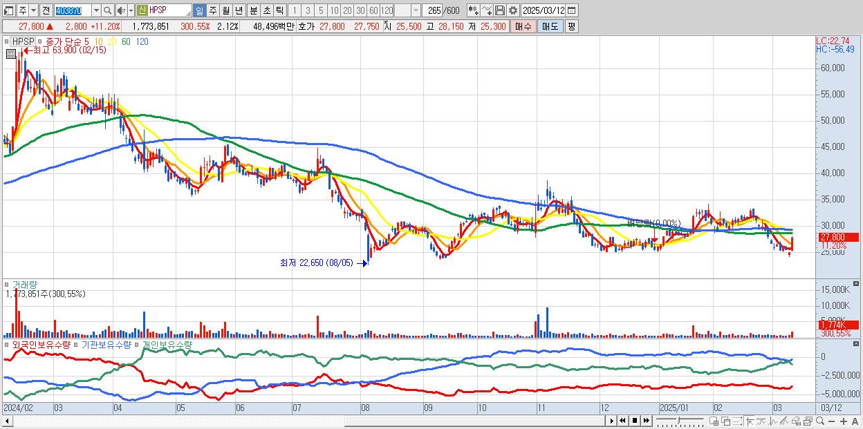 - HPSP (27,800원 ▲ 11.2% , 시총: 23,213억, 거래량: 1,773,851, 거래대금:485억)
