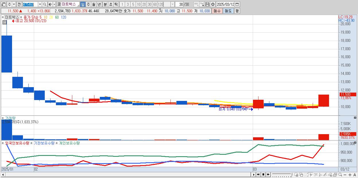 - 미트박스 (11,500원 ▲ 13.86% , 시총: 643억, 거래량: 2,594,783, 거래대금:286억)