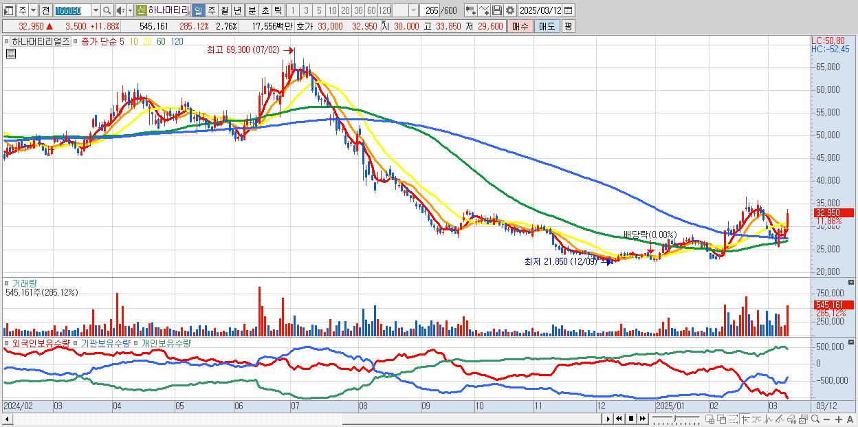 - 하나머티리얼즈 (32,950원 ▲ 11.88% , 시총: 6,517억, 거래량: 545,161, 거래대금:176억)