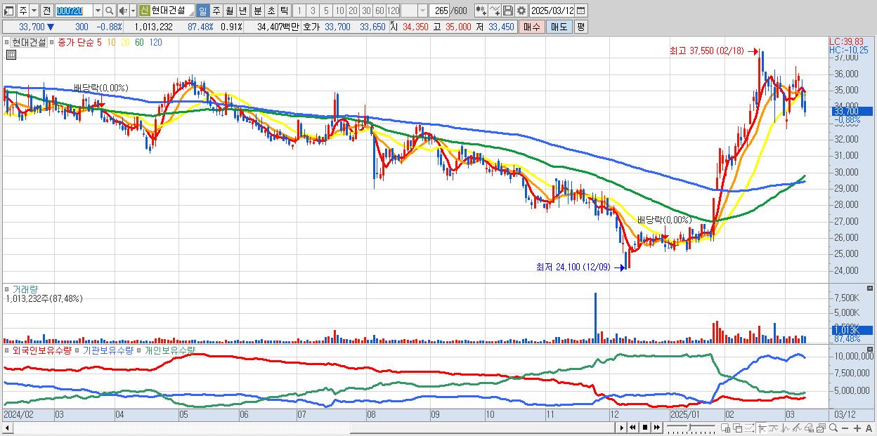 - 현대건설 (33,700원 ▼ -0.88% , 시총: 37,527억, 외국인 순매수 거래금:44억)