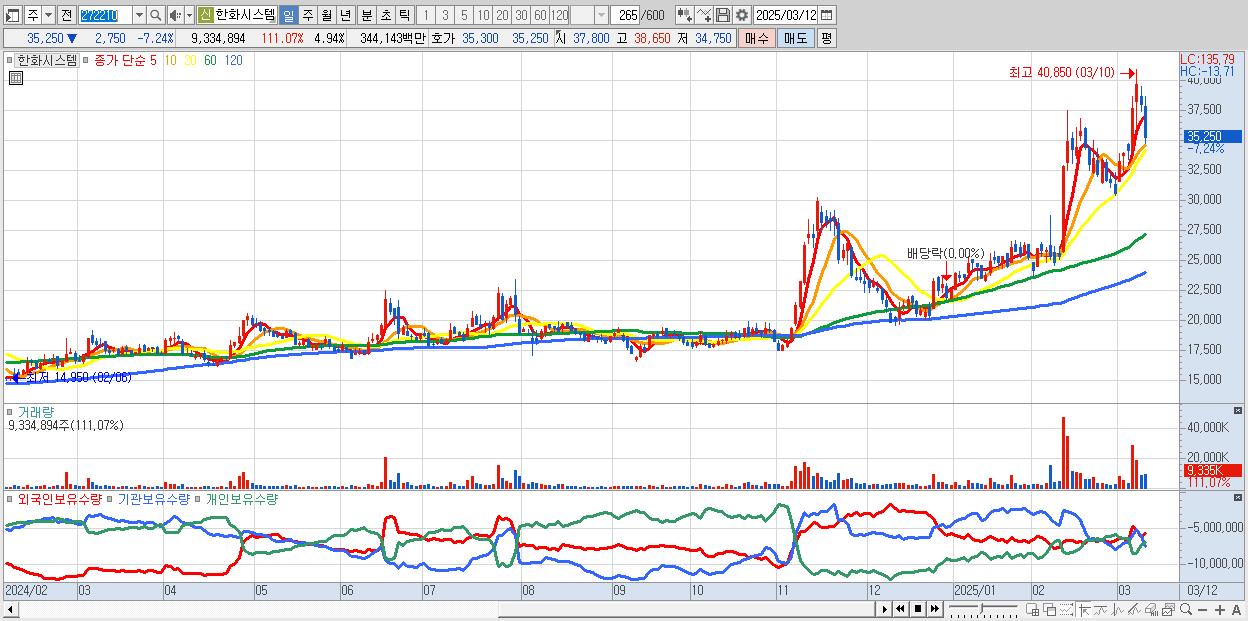 - 한화시스템 (35,250원 ▼ -7.24% , 시총: 66,594억, 외국인 순매수 거래금:189억)