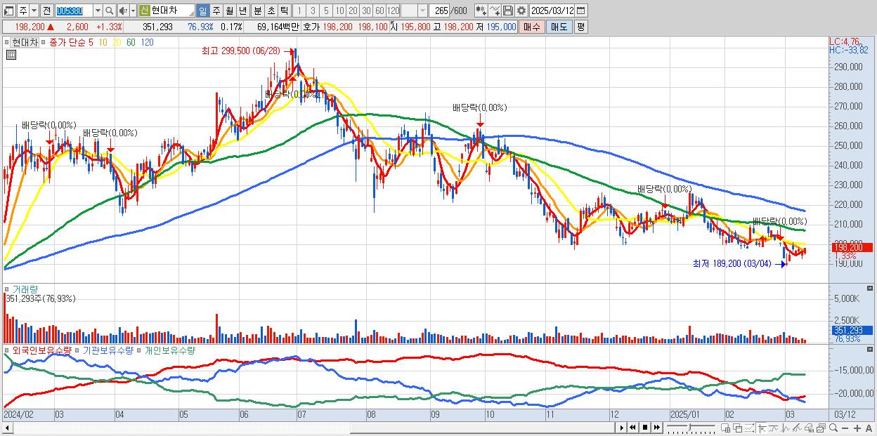 - 현대차 (198,200원 ▲ 1.33% , 시총: 415,063억, 외국인 순매수 거래금:189억)