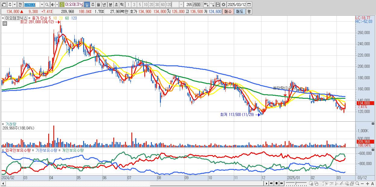 - 이오테크닉스 (134,800원 ▲ 7.41% , 시총: 16,607억, 외국인 순매수 거래금:59억)