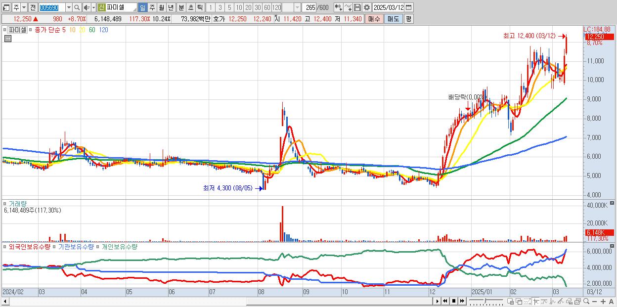- 파미셀 (12,250원 ▲ 8.7% , 시총: 7,352억, 외국인 순매수 거래금:43억)