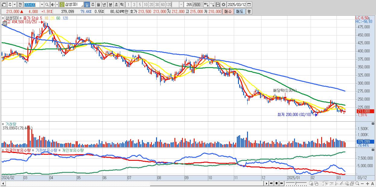 - 삼성SDI (213,000원 ▲ 1.91% , 시총: 146,468억, 외국인 순매수 거래금:127억)