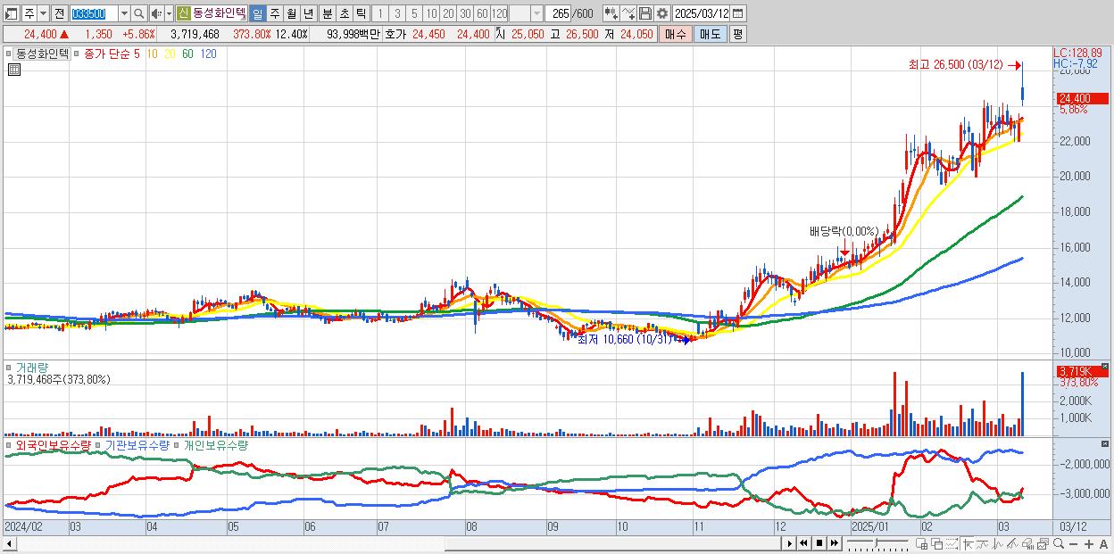 - 동성화인텍 (24,400원 ▲ 5.86% , 시총: 7,317억, 외국인 순매수 거래금:52억)